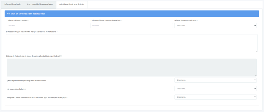 En la pestaña Gestión de Agua de Lastre se encuentra registrada la siguiente información