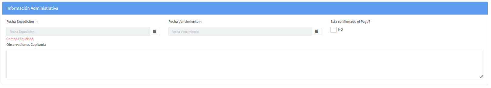 Este botón esta habilitado para guardar la información que registra en el bloque "Información Administrativa". Ingrese la fecha de expedición, y de vencimiento del permiso de permanencia, seleccione la casilla de verificación de pago si aplica, y registre las observaciones que considere oportunas agregar.