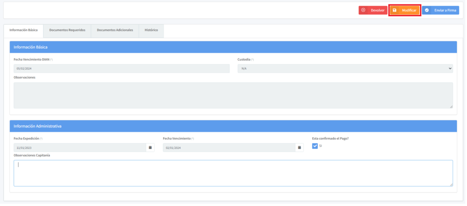 Una vez registrada toda la información Administrativa. diríjase a la parte superior de la pantalla y de clic en el botón "Modificar"
