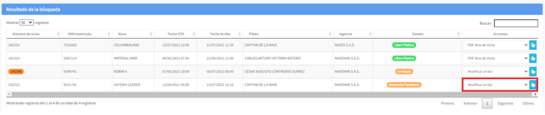 La opción Modificar Arribo, esta habilitada únicamente para aquellos arribos que se encuentren en estado Atracada/Fondeada. Diríjase a la columna acciones, seleccione la opción "Modificar arribo" y de clic en el icono representado por una mano.