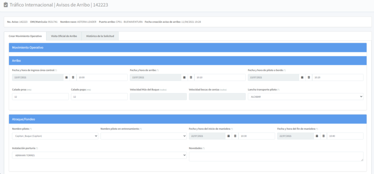 El sistema lo enviará al formulario de arribo, para que realice las correcciones requeridas en la pestaña "Movimiento Operativo" y haga el registro de la visita oficial de arribo. Ver pasos en: Visita Oficial de Arribo
