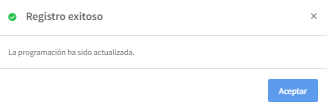 Una vez finalice de clic en el botón “Guardar”” que se encuentra en la parte inferior de la pantalla. El sistema le mostrará un mensaje de confirmación, indicando que se ha modificado de forma exitosa la programación.