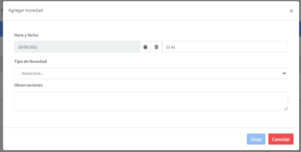 El sistema abrirá la ventana para el registro de la novedad. Ingrese hora, fecha, seleccione el tipo de novedad e ingrese las observaciones correspondientes.