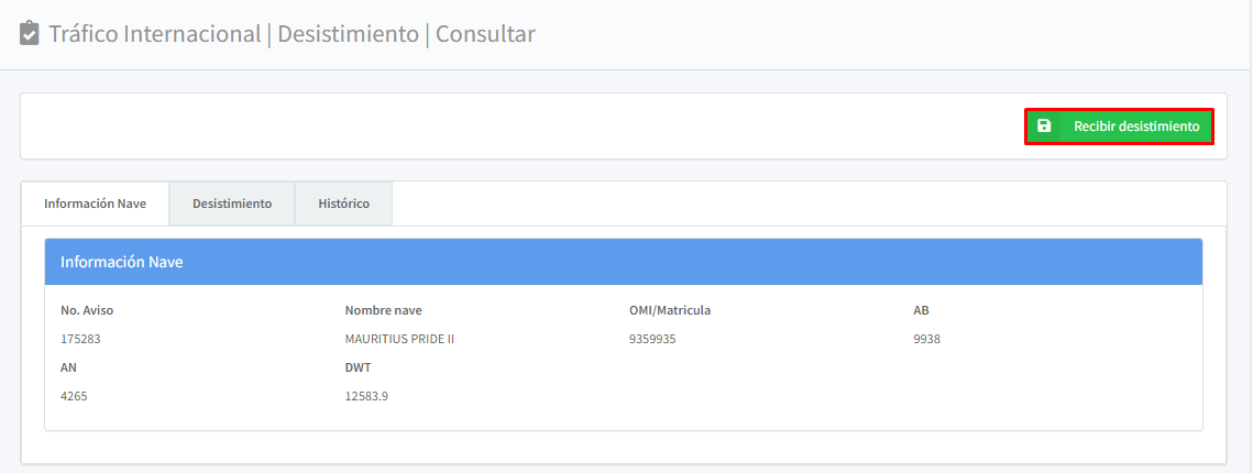 El sistema lo dirigirá a las pestañas en las que se encuentra la información del desistimiento, seleccione el botón "Recibir desistimiento".