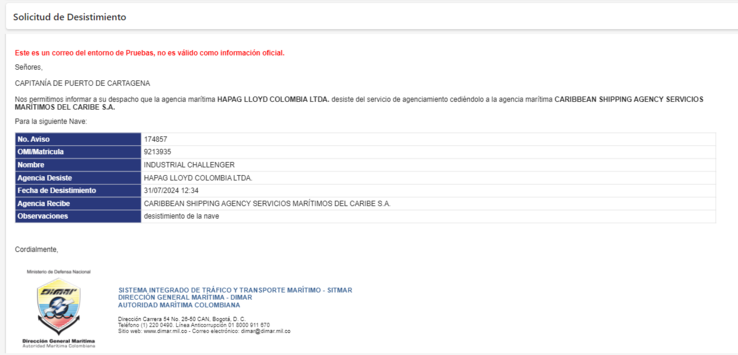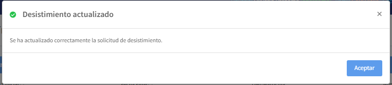 Al dar clic en el botón "Recibir desistimiento", le aparecerá una mensaje que le indicará que la solicitud de desistimiento se ha actualizado.