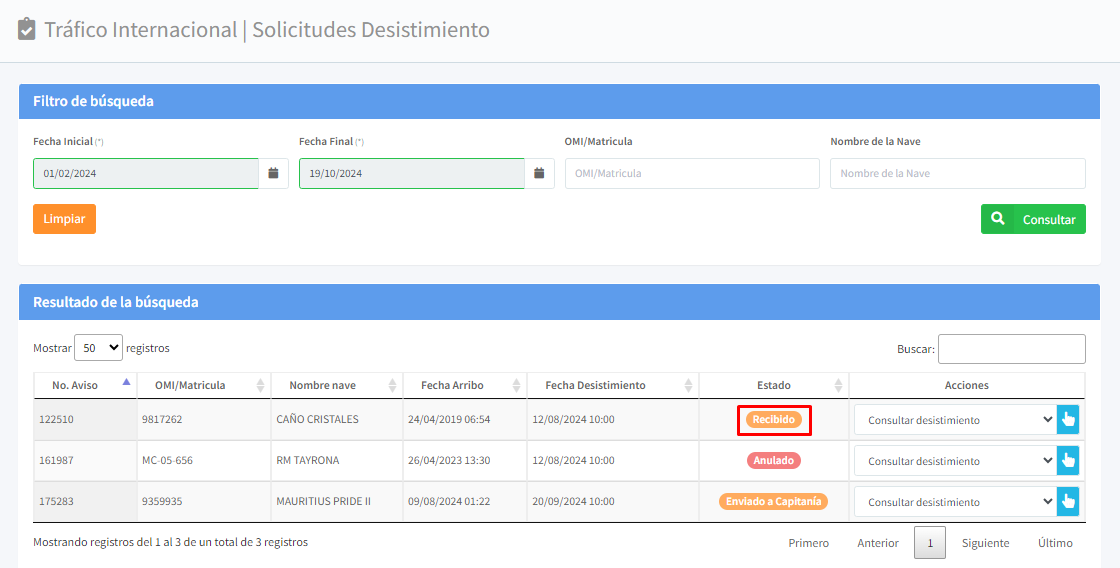 Al finalizar, podrá ver reflejado el cambio de estado de la solicitud en la pantalla de Desistimiento.