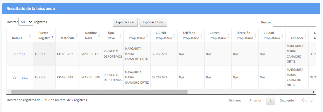 La opción Consultar Naves y Artefactos del módulo Naves y Artefactos, cuenta con un filtro de búsqueda y unos parámetros que facilitan la búsqueda. Usted puede realizar la búsqueda por uno o mas criterios.