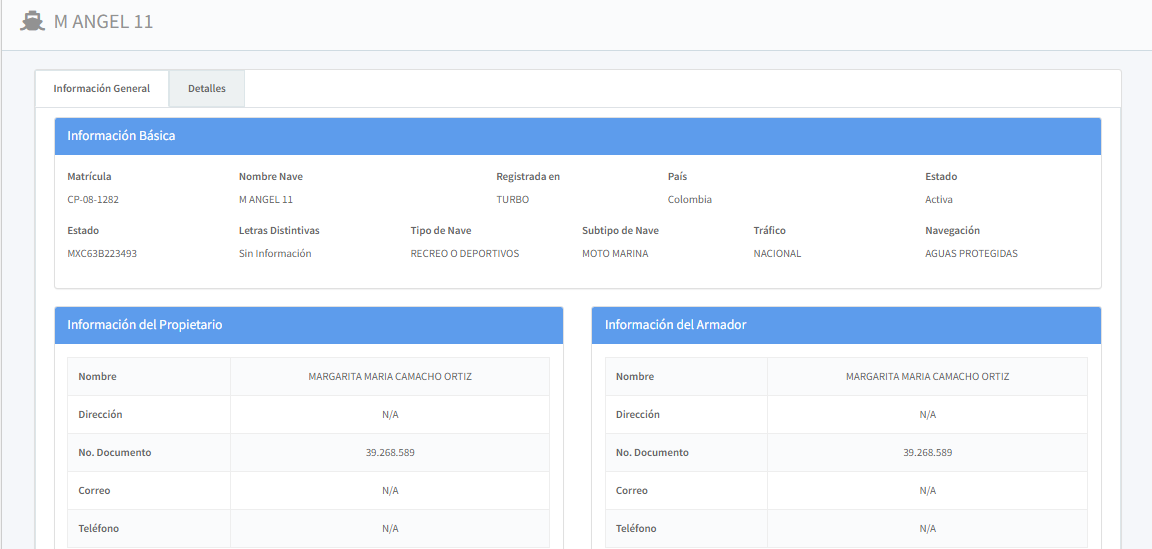 El sistema le mostrará una nueva ventana con dos pestañas en las que se encuentra toda la información registrada en gente de mar. Esta información es solo de consulta, no podrá ser modificada.