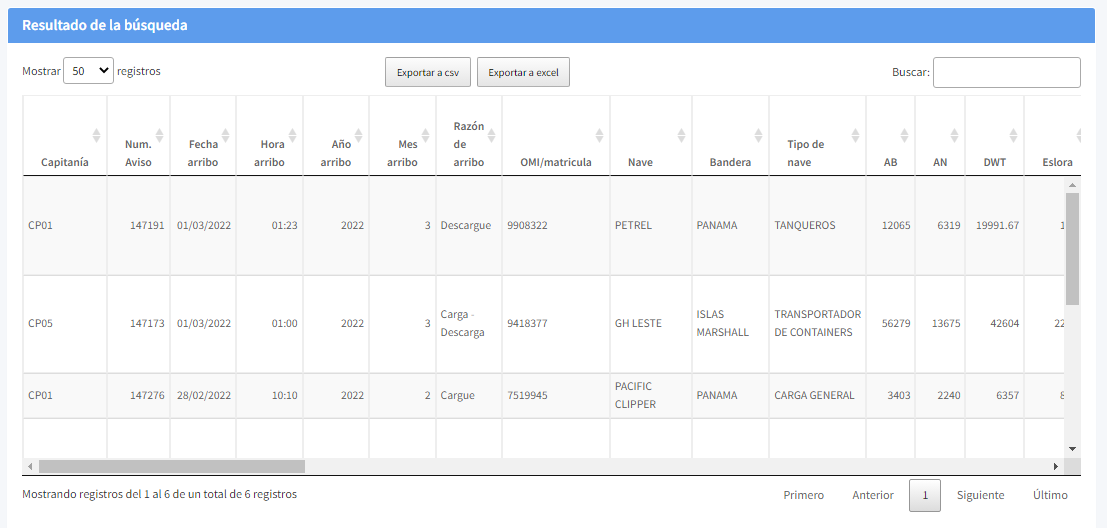 Existen dos formatos disponibles para exportar el listado de arribos internacionales (Exportar a csv / Exportar a excel)