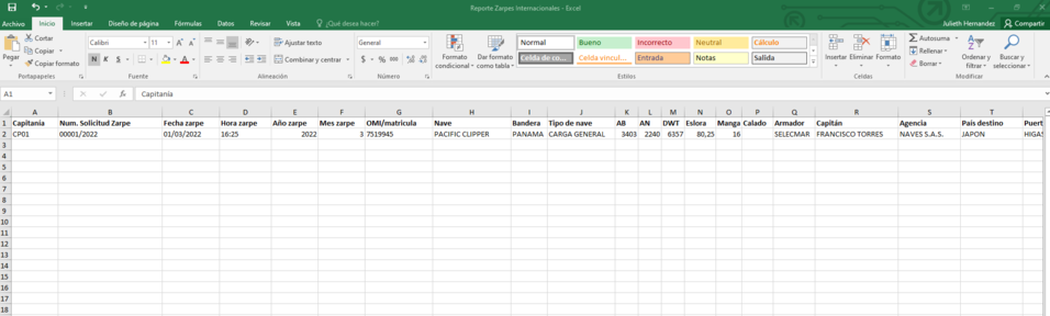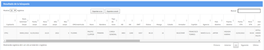Existen dos formatos disponibles para exportar el listado de zarpes internacionales (Exportar a csv / Exportar a excel)