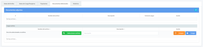 La pestaña "Documentos Adicionales", se habilita una vez se crea la solicitud de Zarpe. Seleccione los archivos correspondientes y de clic en el botón Cargar.