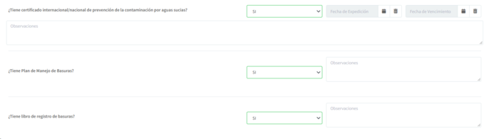 - Si la opción de respuesta a cada uno de los primeros 5 enunciados es SI, frente a a la selección se habilitaran los campos para el registro de las fechas de expedición y de vencimiento.