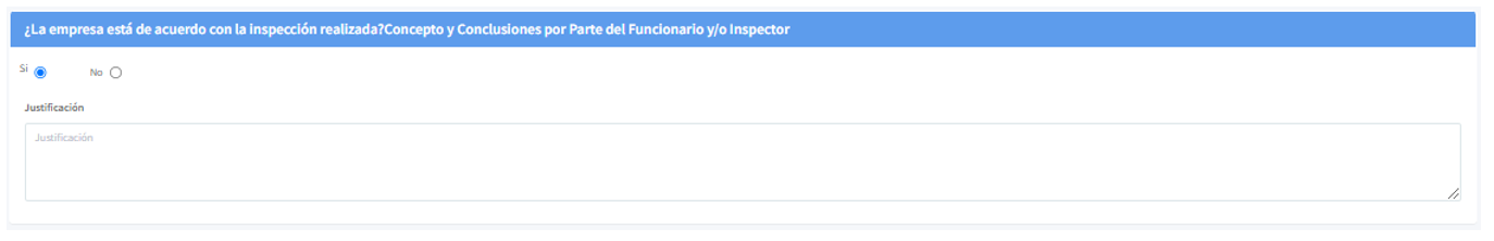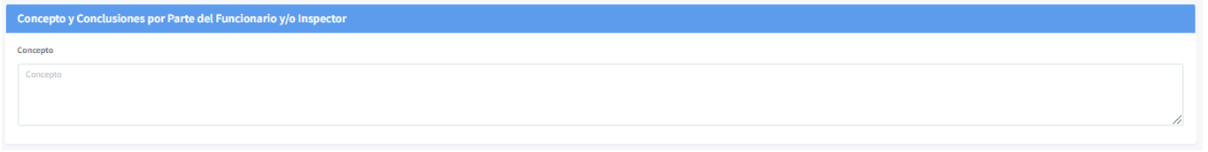 En esta sección se mostrará la ventana para registrar el concepto y conclusiones del inspector en la visita de inspección. Campo obligatorio.