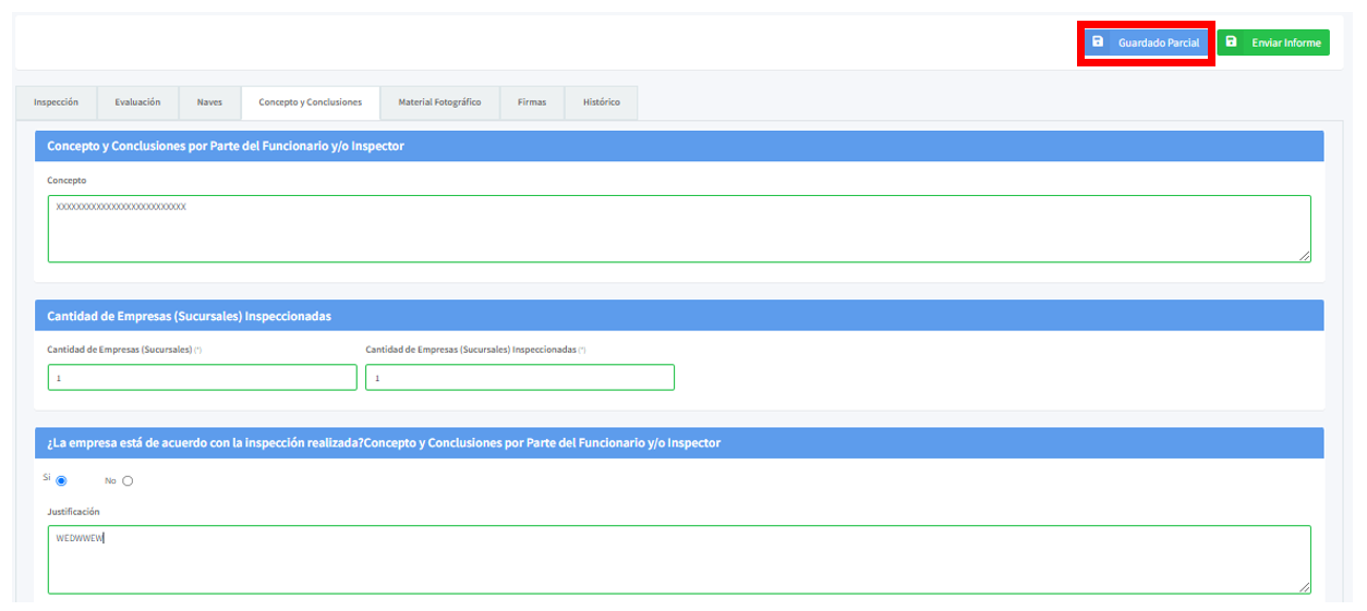 Nota: Realice las actualizaciones requeridas y de clic en el botón "Guardado parcial".