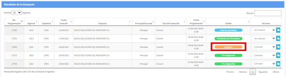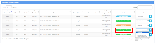 Para confirmar una programación de visita de control, busque aquellas solicitudes que se encuentren en estado "Pre-Asignación", seleccione la opción Consultar de la columna acciones y de clic en el icono representado por una mano.