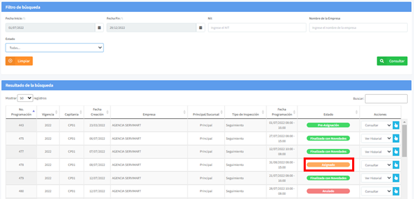 Una vez seleccionados los criterios de búsqueda, de clic en el botón "Consultar”. Inmediatamente en la parte inferior de la pantalla, le aparecerán todos aquellos registros que cumplan con los parámetros de búsqueda asociados. Utilice el botón "Limpiar", para borrar los criterios de búsqueda seleccionados e iniciar otra consulta.
