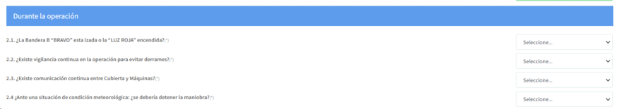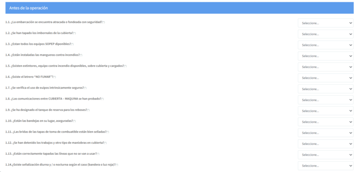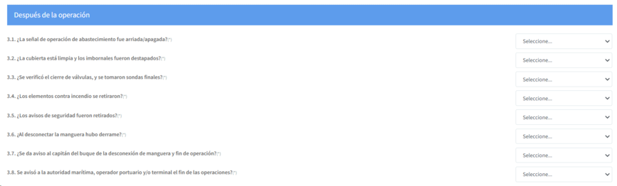 - La pregunta 1.17 (En caso de suministro o descarga de combustibles a buques y plataformas indique el tipo de operación de suministro), encuentra las opciones de respuesta Camión/Carrotanque, Buque/Embarcación, Estación de servicio móvil, Estación de servicio fija, Artefacto naval o Barcaza