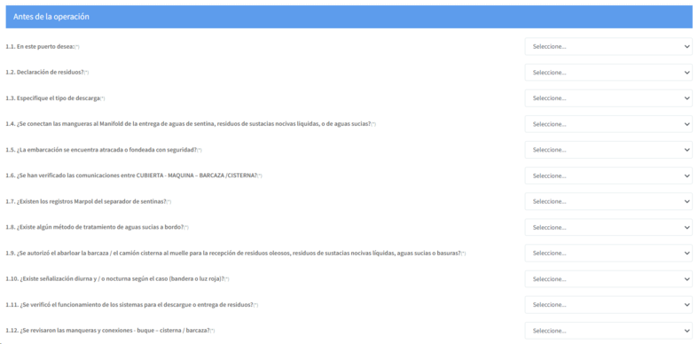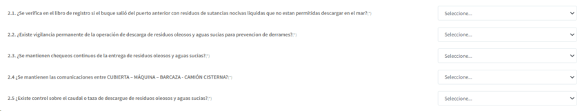 - La pregunta 1.1 (En este puerto desea), encuentra las opciones de respuesta Entregar todos los desechos, entregar parte de los desechos, y realizar lavado de tanques sin descargar