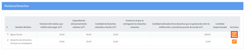 a. Residuos/Desechos: Aquí encontrara el listado de residuos y desechos reportados por la agencia cuando hizo el aviso de arribo. Usted puede adicionar información de cantidades dando clic en el icono de la columna acciones.