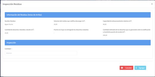 En sistema le mostrará la ventana para el registro de cantidades de residuos/desechos. Registre el dato en el campo "Volumen" y de clic en el botón Agregar. El dato se registrara en el sub-bloque Residuos/Desechos, en la columna Cantidad inspeccionada.