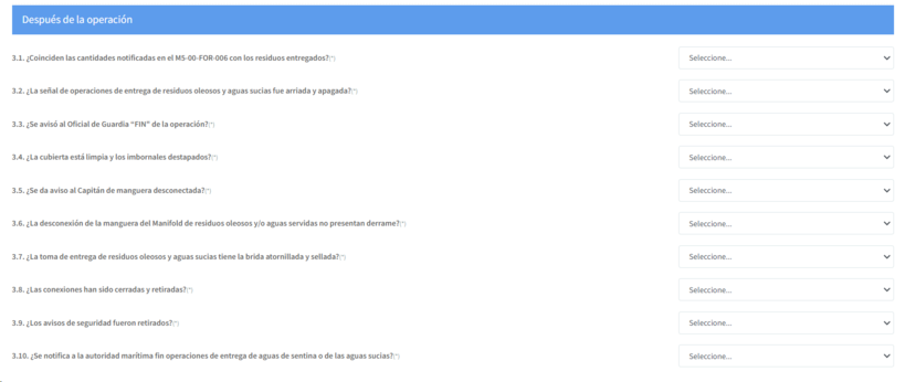 4. Despues de la operación: En este bloque encontrará un listado de 10 preguntas, correspondientes al control despues de la operación. Frente a cada una de ellas, están las opciones de respuesta SI, NO y NO APLICA. Seleccione según corresponda.
