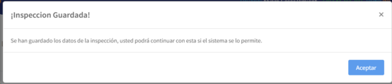 El sistema le mostrará un mensaje de confirmación, indicando que la inspección se ha guardado de forma exitosa. Una vez de clic en el botón "Aceptar" el sistema lo dejara dentro del formulario para que pueda continuar con su registro.