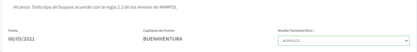 a. La primera parte de la pestaña información inicial muestras el alcance del informe, la fecha de elaboración, y la Capitanía. En el campo Muelle/Terminal/Otro, seleccione del listado, el lugar en donde se realizara la inspección.