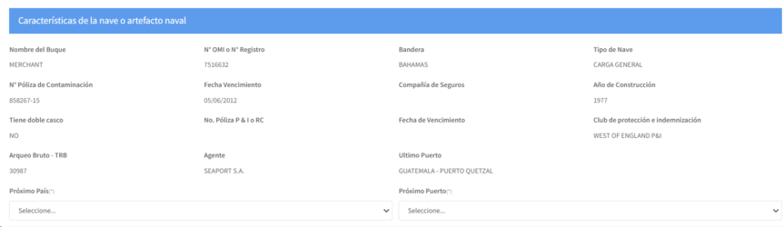 b. Características de la nave: Este bloque muestra las características principales de la nave o artefacto naval. En la parte final de este bloque, están los campos para la selección del próximo país y puerto a donde llegará la nave o artefacto naval.