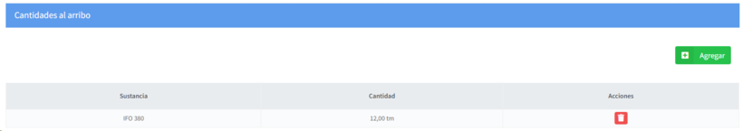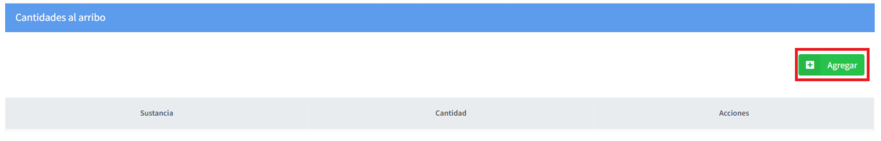 c. Cantidades al Arribo: Para agregar las cantidades de sustancias al arribo, de clic en el botón "Agregar"