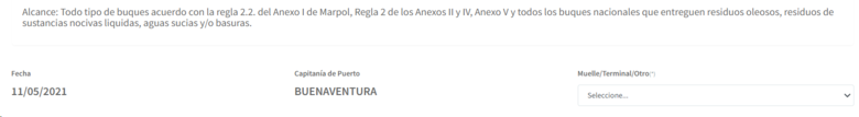 a. La primera parte de la pestaña información inicial muestras el alcance del informe, la fecha de elaboración, y la Capitanía. En el campo Muelle/Terminal/Otro, seleccione del listado, el lugar en donde se realizara la inspección.