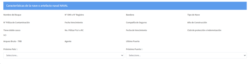 b. Características de la nave:  Este bloque muestra las características principales de la nave o artefacto naval. En la parte final de este bloque, están los campos para la selección  del próximo país y puerto a donde llegará la nave o artefacto naval.