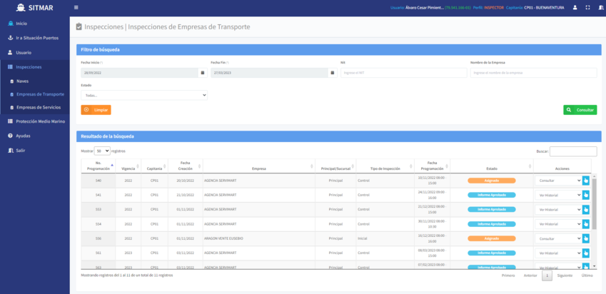 El Sistema de Inspecciones de control a Empresas de Servicios Marítimos ha sido diseñado para automatizar el procedimiento de programación, aceptación de la programación, asignación de inspector y ejecución de las inspecciones de control con el fin de facilitar su gestión integral, iniciando desde el momento en que el gestor de la capitanía o de sede central realiza la programación, la envía a la empresa/agencia e inspector para su aprobación, se desarrolla la inspección y finaliza con la consulta y descarga del informe de inspección.
