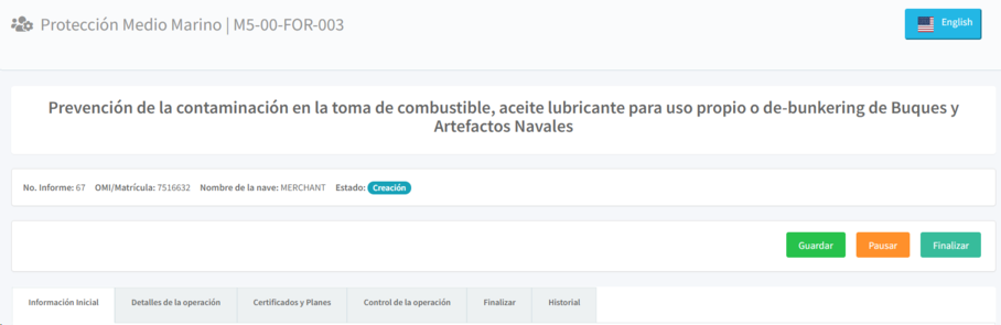 Una vez de seleccione la opción "Iniciar" de la columna acciones, el sistema le mostrará el formato para el registro del informe de prevención de la contaminación en la toma de combustible, el cual esta dividio en las siguientes pestañas: