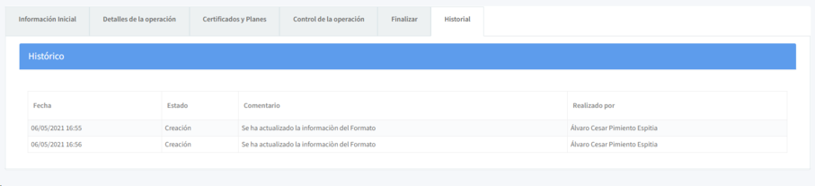 En la pestaña Historial, usted podrá consultar los estados y observaciones hechas en cada paso de la inspección.