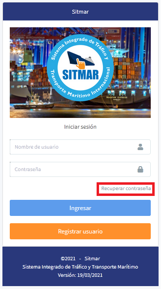 2. Nombre de Usuario (Login): Ingrese el Login dado por el sistema en el momento de crear el usuario. (Este dato es creado con el numero de identificación registrado, guión y código de la capitanía a la que pertenece el usuario)