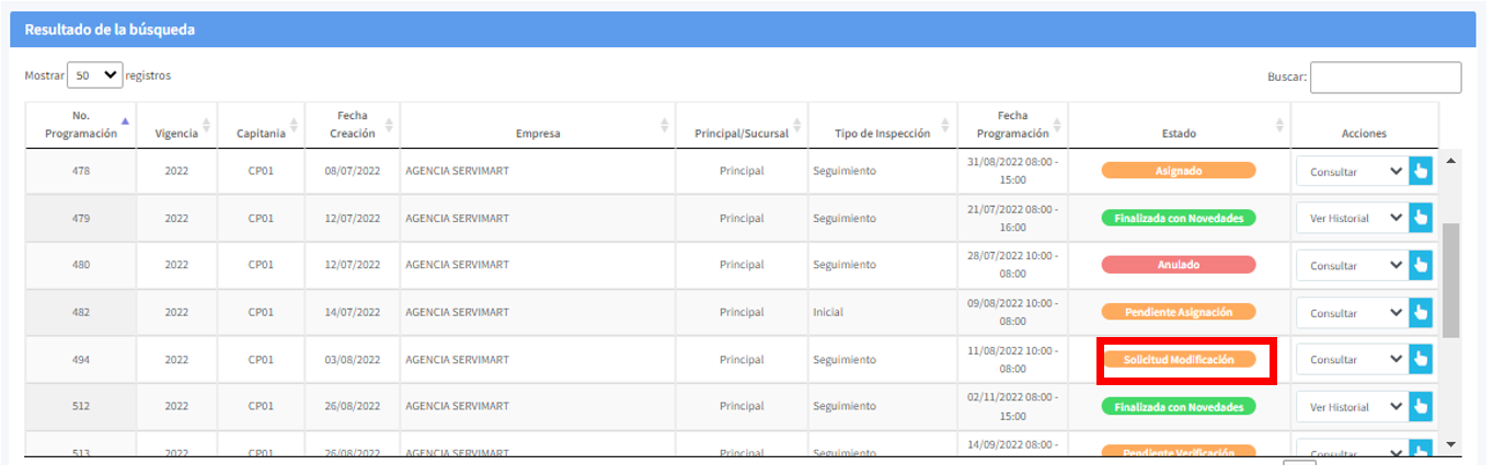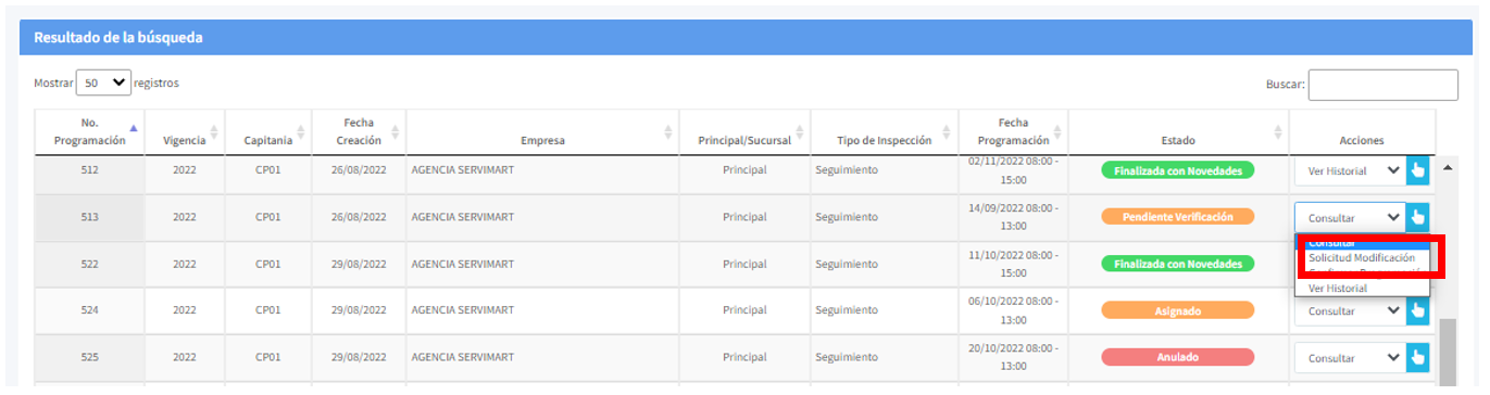 La opción de resultados de la búsqueda en el módulo de Inspecciones cuenta con unos parámetros que facilitan su modificación. Usted puede solicitar la modificación de la fecha de programación de la visita a través de la opción “Solicitar Modificación” de la columna acciones y de clic en el icono representado por una mano.