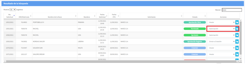 Cuando la solicitud de permiso especial de cabotaje encuentra en estado "Aprobado" , en la columna acciones se habilitará la opción "Autorización" en la columna acciones