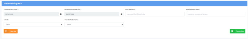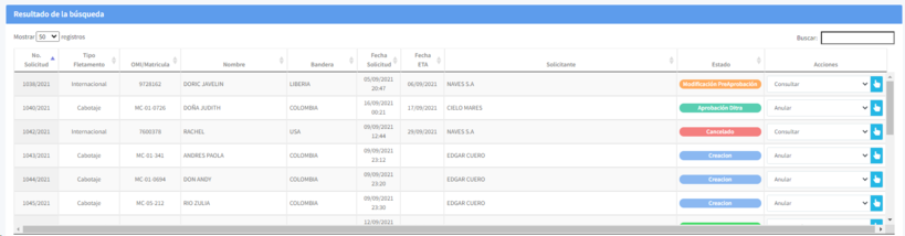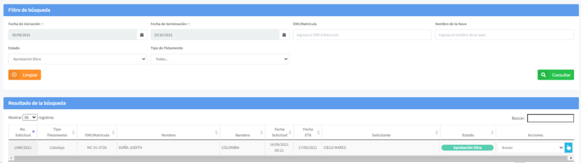 El módulo Fletamento, del sistema de transporte Marítimo nacional e intencional, cuenta con unos parámetros que facilitan la búsqueda de solicitudes. Usted puede realizar la búsqueda por uno o mas criterios.