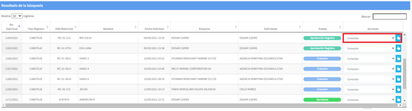 1. Revise el listado de registros que aparece en la parte inferior de la pantalla, seleccione la acción "Consultar" y de clic en el icono representado por una mano.