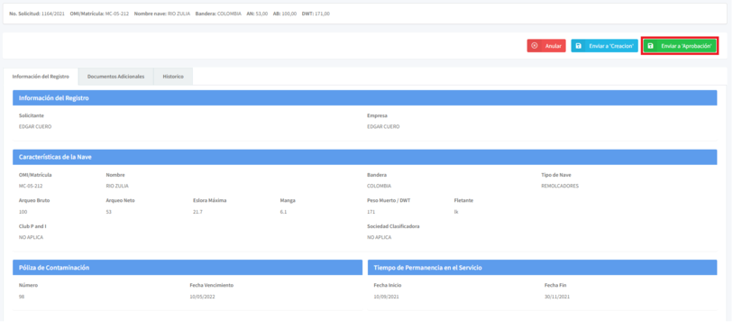 El sistema lo enviará al formulario de registro que creo la agencia. En la parte superior de la pantalla se encuentra el botón "Enviar a Aprobación". De clic en el botón correspondiente.