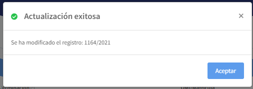 El sistema le mostrará un mensaje de confirmación, indicando que el registro ha sido modificado y queda en estado "Aprobación Ditra"