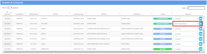 2. Revise el listado de registros que aparece en la parte inferior de la pantalla, seleccione la acción "Enviar a Aprobación" y de clic en el icono representado por una mano.