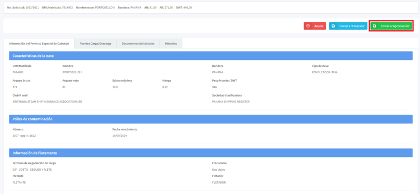 El sistema lo enviará al formulario de permiso especial de cabotaje que creo la agencia. En la parte superior de la pantalla se encuentra el botón "Enviar a Aprobación". De clic en el botón correspondiente.