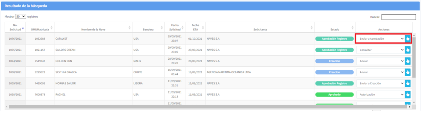 2. Revise el listado de permisos especiales de cabotaje que aparecen en la parte inferior de la pantalla, seleccione la acción "Enviar a Aprobación" y de clic en el icono representado por una mano.