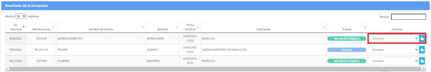 1. Revise el listado de permisos ocasionales de pasajeros que aparece en la parte inferior de la pantalla, seleccione la acción "Consultar" y de clic en el icono representado por una mano.