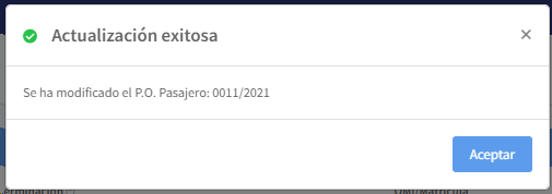 El sistema le mostrará un mensaje de confirmación, indicando que el permiso ocasional de pasajeros ha sido modificado y queda en estado "Aprobación Ditra"