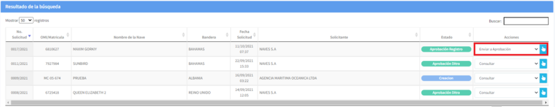 2. Revise el listado de permisos ocasional de pasajeros que aparecen en la parte inferior de la pantalla, seleccione la acción "Enviar a Aprobación" y de clic en el icono representado por una mano.