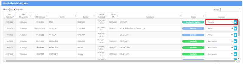 1. Revise el listado de fletamentos que aparece en la parte inferior de la pantalla, seleccione la opción consultar y de clic en el icono representado por una mano.