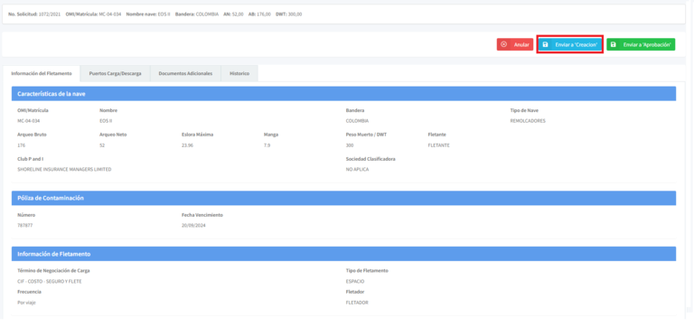 El sistema lo enviará al formulario de fletamento que creo la agencia. En la parte superior de la pantalla se encuentra el botón "Enviar a Creación". De clic en el botón correspondiente.