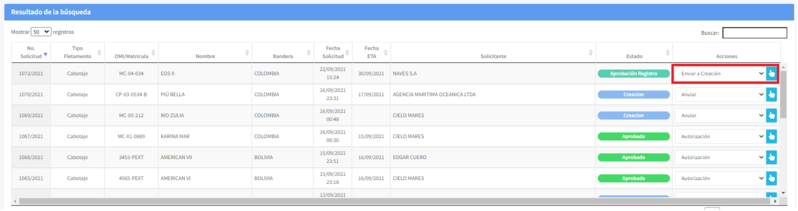 2. Revise el listado de fletamentos que aparece en la parte inferior de la pantalla, seleccione la acción "Enviar a Aprobación" y de clic en el icono representado por una mano.